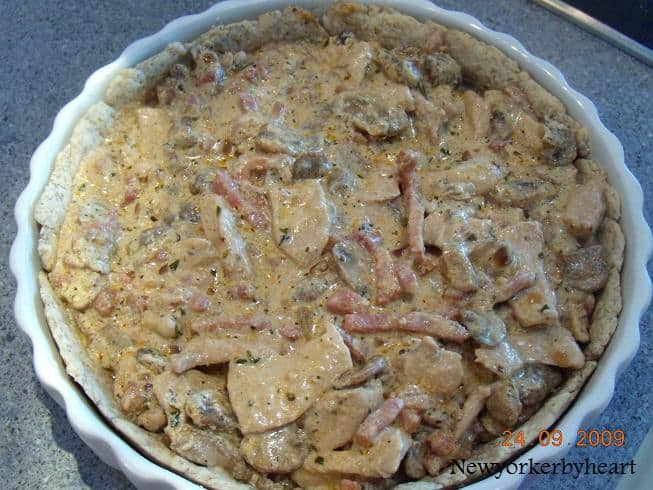 - Kom fyldet til din kyllingetærte i den forbagte tærtebund.